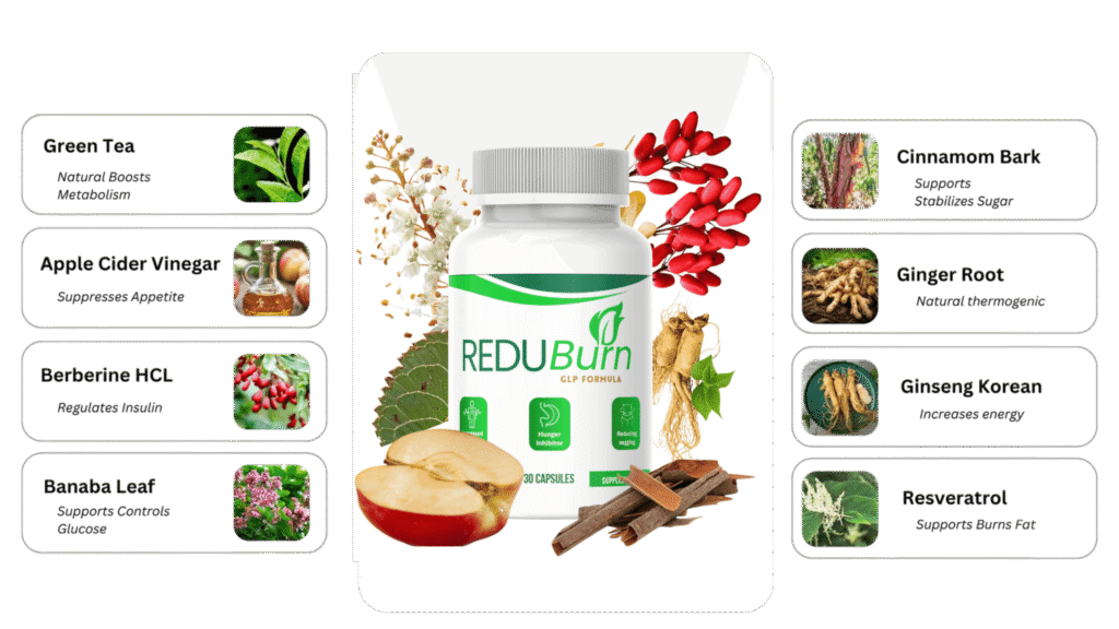 ReduBurn contains powerful natural ingredients that support healthy weight loss by boosting metabolism, reducing appetite, and increasing energy levels.